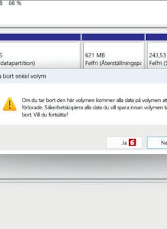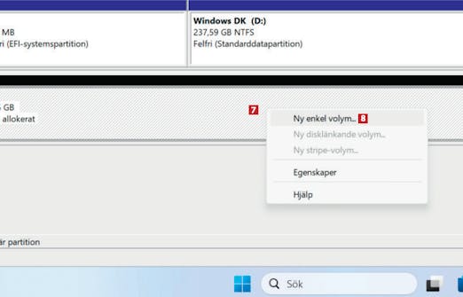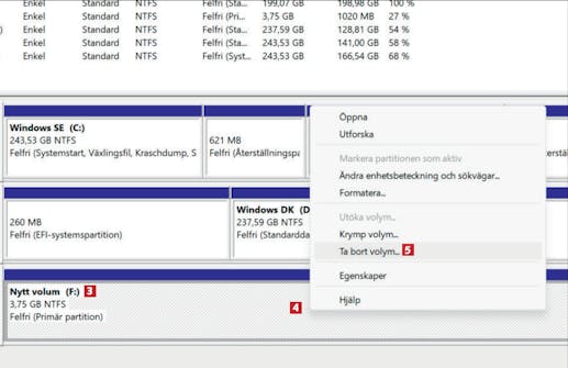 Leta reda på ditt USB-minne i översikten 3, högerklicka på partitionen 4 och välj Ta bort volym… 5.