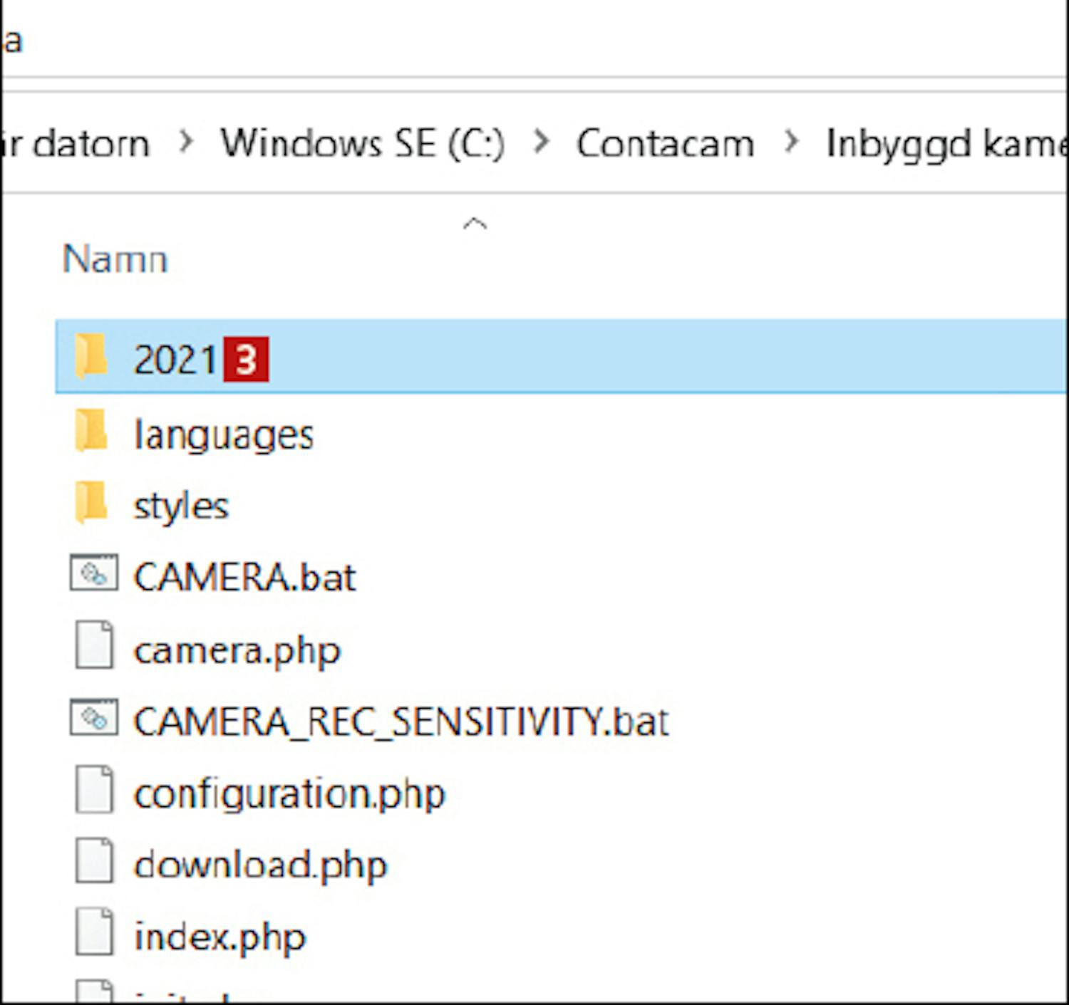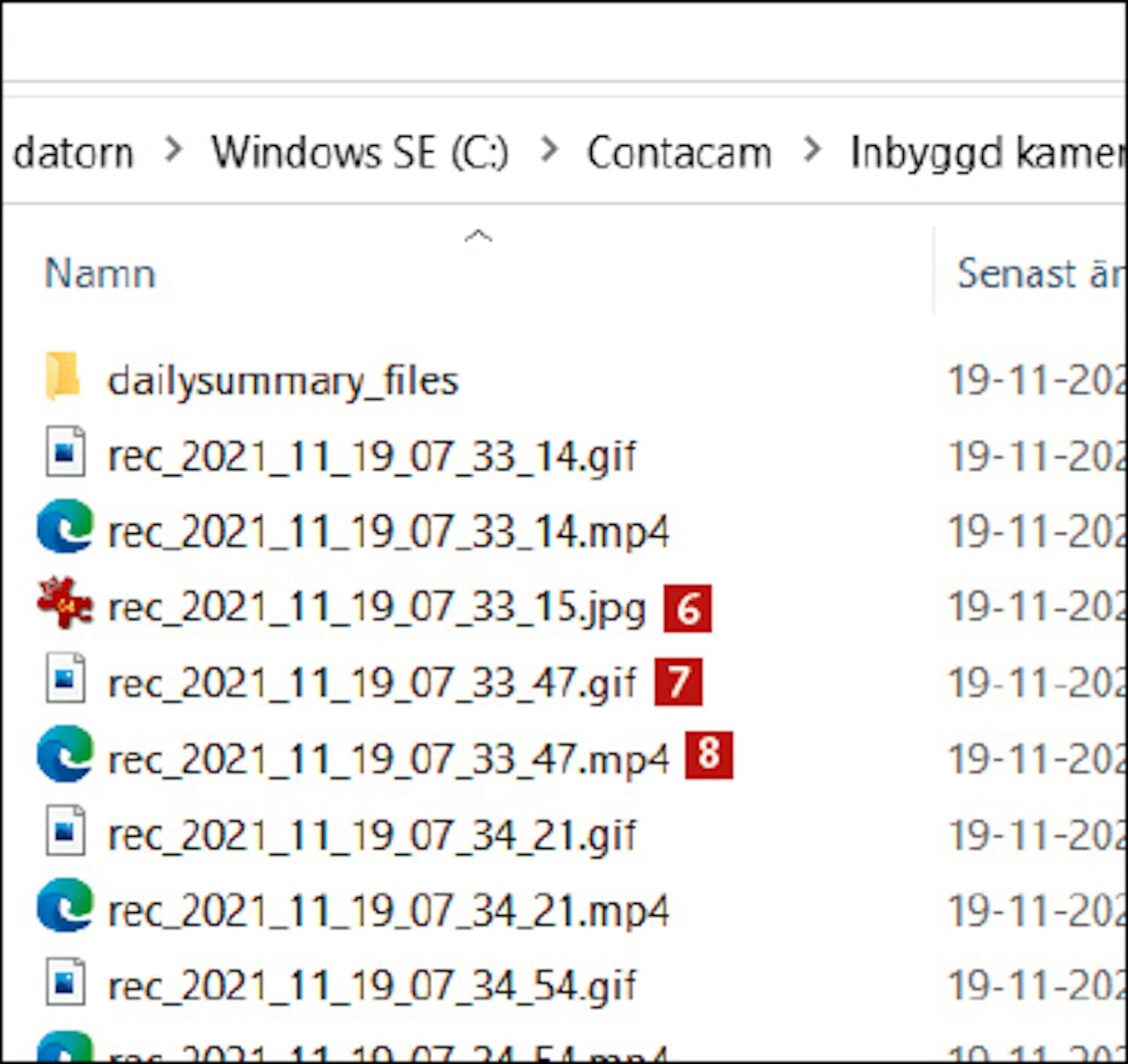 Vi föreställer oss nu att du kommer hem och vill kolla om det har hänt något medan du var borta. Det gör du i programmets mapp i Utforskaren, där videoklipp och foton ligger sorterade efter datum.