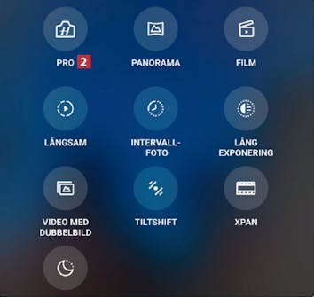 Tryck på kategorin PRO 2. Kategorin kan också heta Pro Camera eller Pro Mode hos andra tillverkare.