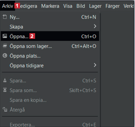 Först ska du hämta och installera Gimp från vår webbplats. Öppna programmet och klicka på Arkiv 1. Välj sedan menyalternativet Öppna 2.