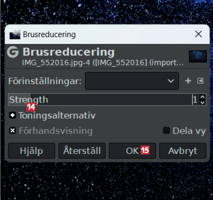 Klicka på reglaget vid Strength, håll musknappen intryckt och dra det åt vänster ungefär till den här punkten 14. Klicka på OK 15, och din bild är färdig.