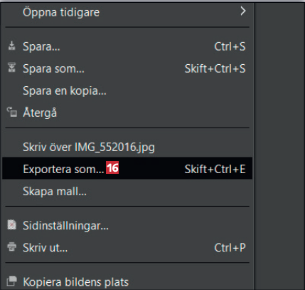 Nu ska fotot sparas. Klicka först på fliken Arkiv uppe i det vänstra hörnet, och välj sedan alternativet Exportera som… 16.