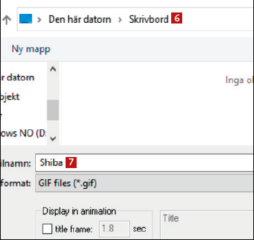 Innan du börjar spela in måste filen förhandssparas. Hitta en plats 6 på datorn, ge GIF:en ett namn 7och klicka på Spara.