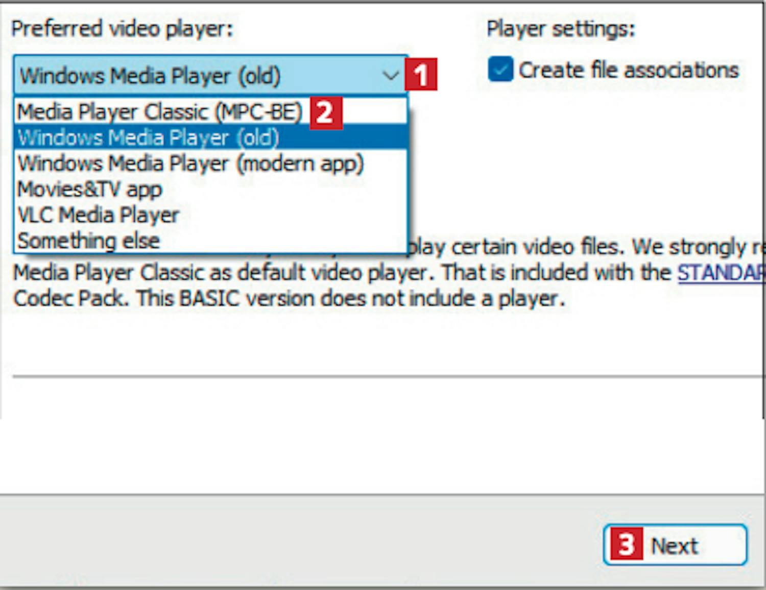 Vid installation av programmet, ska du välja mediaspelare 1. Vi rekommenderar att du väljer Media Player Classic 2, som kan hämtas i Fördelszonen. Klicka sedan på knappen Next 3.