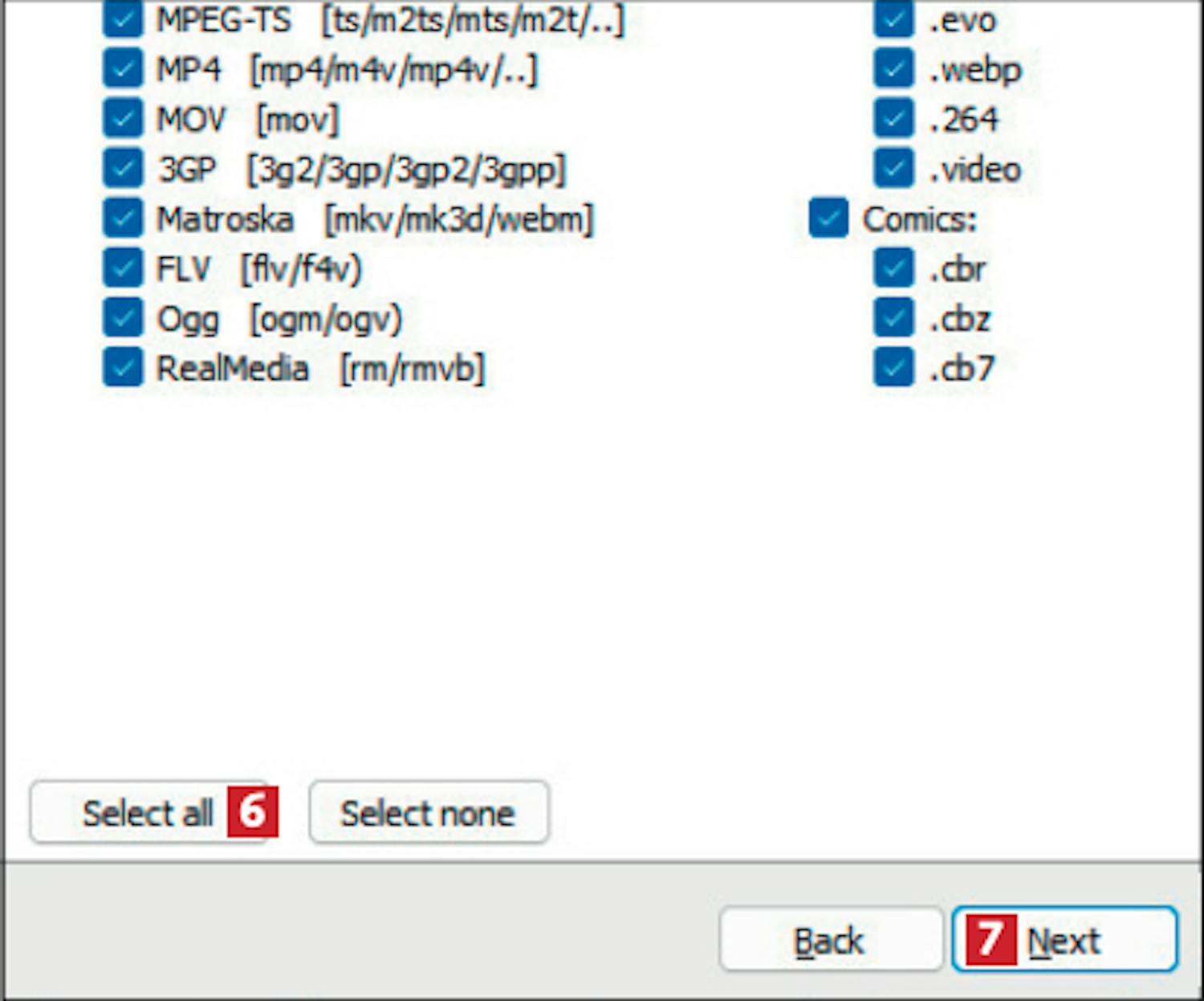 Välj slutligen vilka videooch ljudformat du vill se som miniatyrer i Utforskaren. Klicka på Select all 6 följt av Next 7 . Nu slutförs installationen.