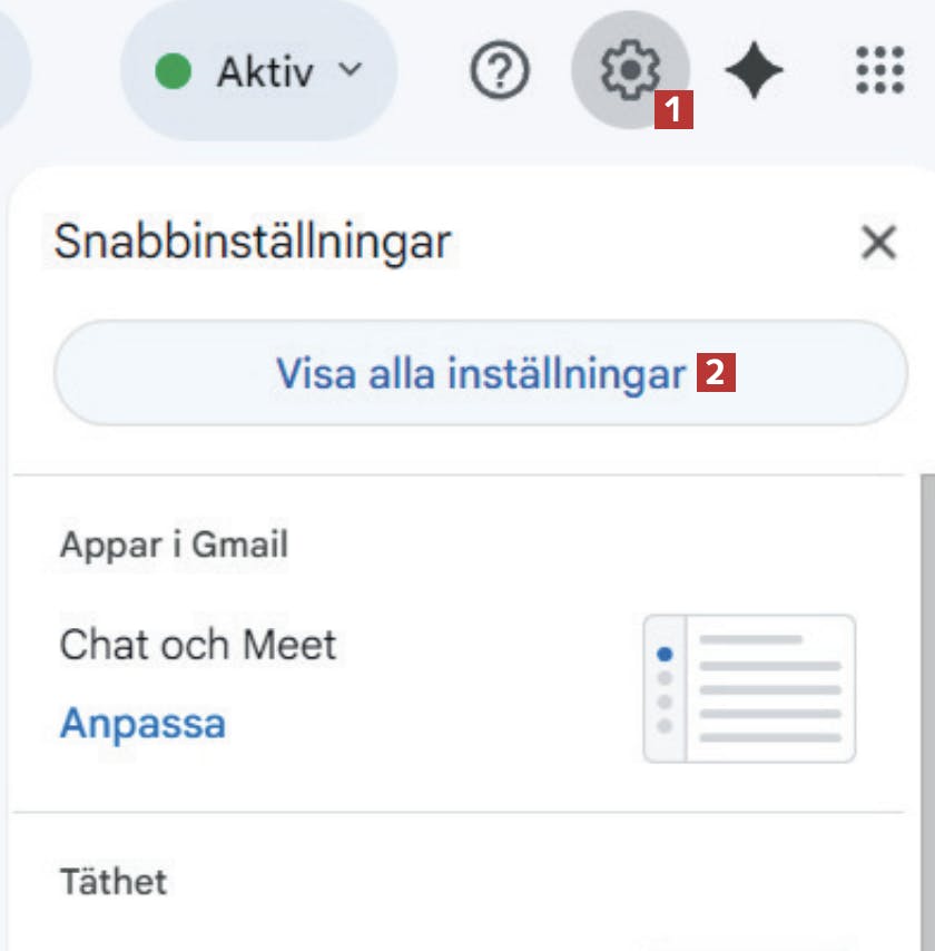 Öppna gmail.com i Chrome. Klicka på kugghjulet 1 uppe till höger. Välj Visa alla inställningar 2.