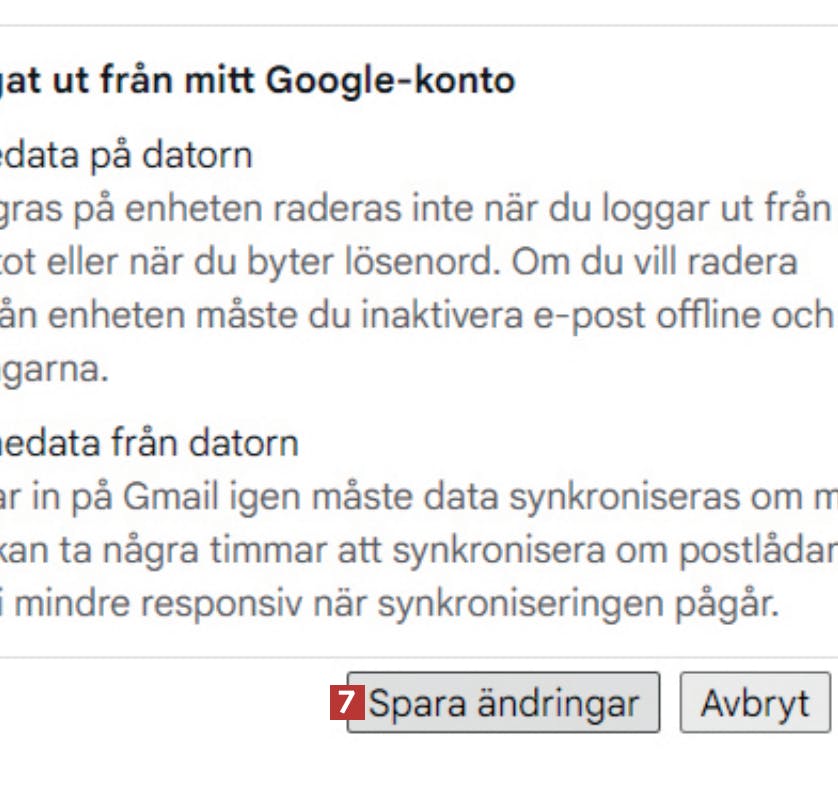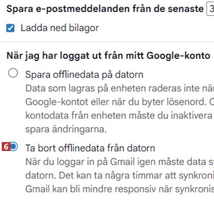 Välj vad som ska hända med ditt arbete när du är utloggad från ditt Google-konto. Vi rekommenderar att Ta bort offlinedata från datorn 6.