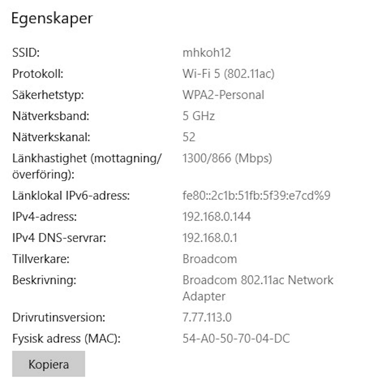 - Vid Nätverksband ser du vilken frekvens (2,4 eller 5 GHz) som nätverket sänds på.