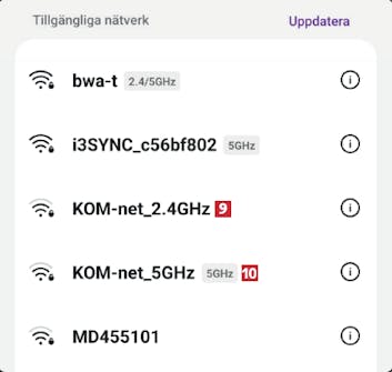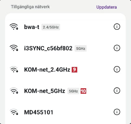 Nästan alla routrar kan använda flera frekvenser, till exempel 2,4 GHz och 5 GHz. Med 5 GHz får du högre hastighet och undviker störningar från nätverk på 2,4 GHz. 2,4 GHz har lägre hastighet men bättre räckvidd.