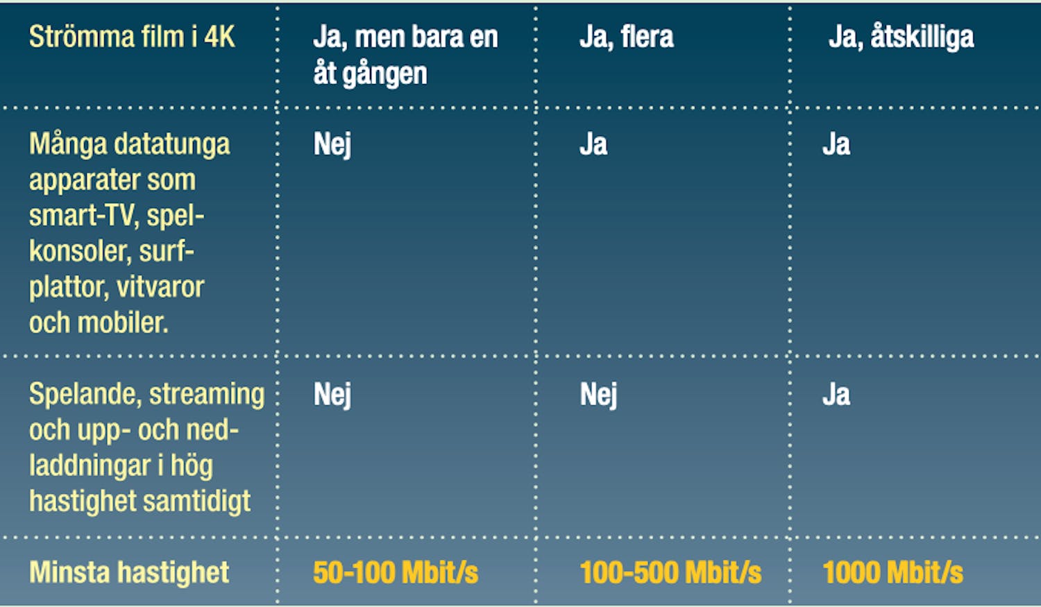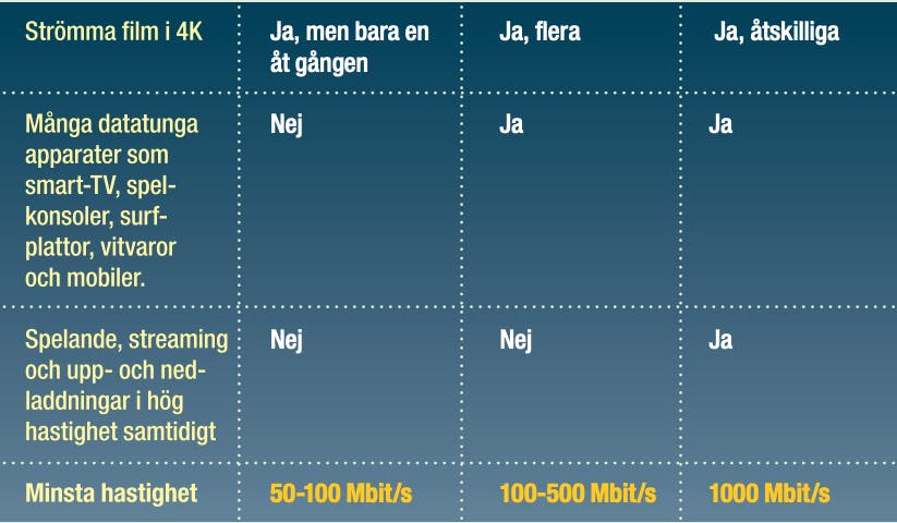 I vår tabell kan du få en uppfattning om hur hög hastighet som behövs beroende på hur många personer som bor i hushållet, hur mycket som är uppkopplat mot internet och vad du gör online varje dag