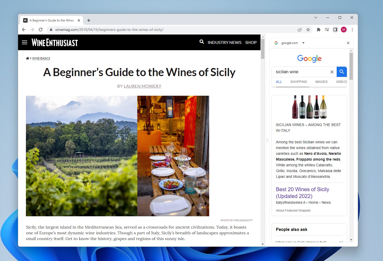 Med den nya funktionen – Sökning på sidopanelen – kan du nämligen öppna ett utökat sökfält som lägger sig till höger i webbläsarfönstret, som du kan se på bilden nedan.