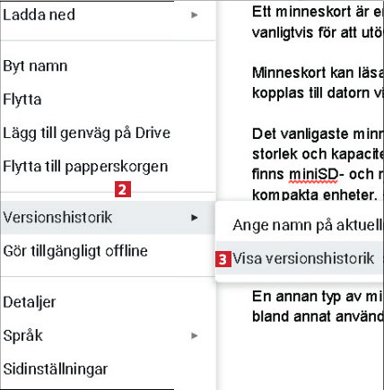 Nu öppnas ett fönster där du till höger kan klicka på de olika versioner 4 av dokumentet som Google har sparat. Versionerna anges med datum och klockslag.