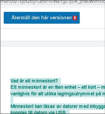 I Google Dokument finns en funktion som kallas versionshistorik, som gör det möjligt att se tidigare versioner av ett dokument. Du kan alltså gå tillbaka i tiden, välja en äldre version och skriva över den nya, felaktiga versionen. Det finns versioner kvar ända till den tidpunkt då du först började skriva på dokumentet.