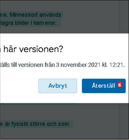 På vänster sida kan du se hur en tidigare version skiljer sig från den aktuella versionen. Om du vill återställa en tidigare version väljer du Återställ den här versionen 5 .