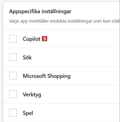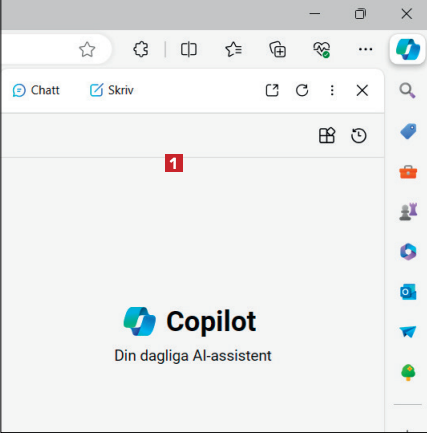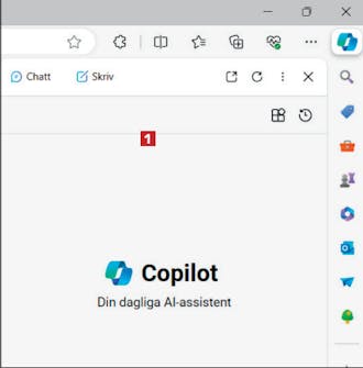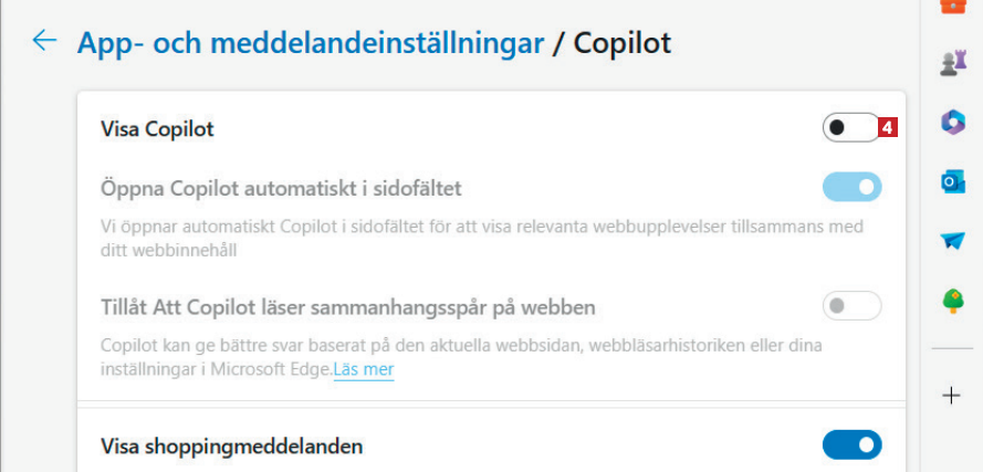 Klick på reglaget 4 vid Visa Copilot, så att det blir vitt. Om knappen Starta om visas klickar du på den för att starta om Edge.