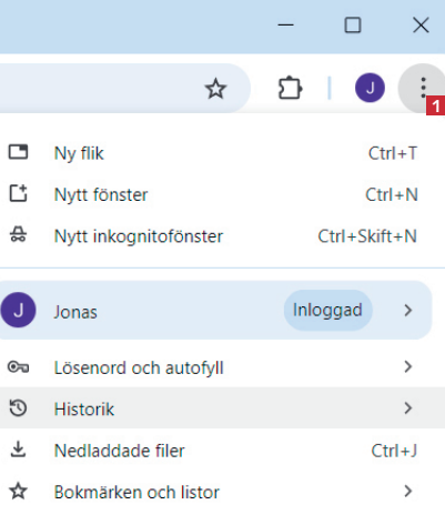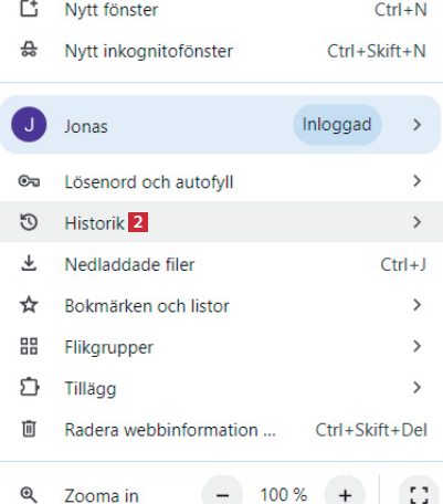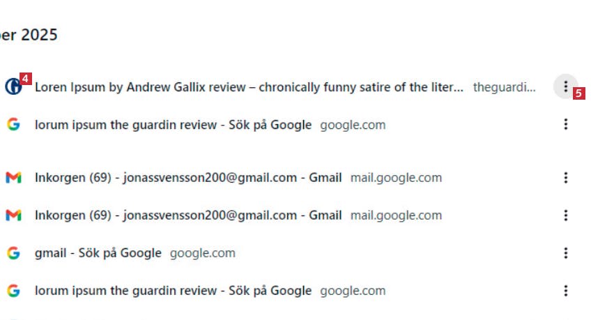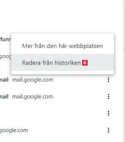 Bläddra genom översikten tills du hittar det besök 4 som du vill ta bort, och klicka på de tre punkterna 5 vid det besöket. Du kan också söka efter en specifik webbplats med hjälp av sökfältet högst upp på sidan.