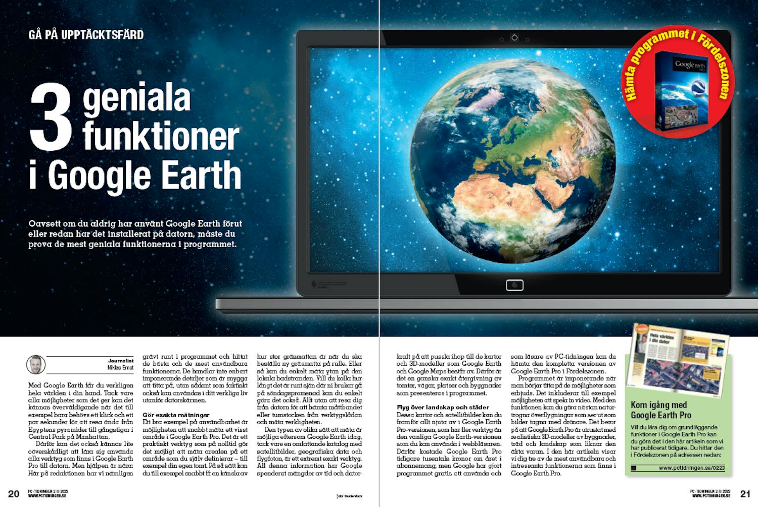 Dessa kartor och satellitbilder kan du framför allt njuta av i Google Earth Pro-versionen, som har fler verktyg än den vanliga Google Earth-versionen som du kan använda i webbläsaren. Därför kostade Google Earth Pro tidigare tusentals kronor om året i abonnemang, men Google har gjort programmet gratis att använda och som läsare av PC-tidningen kan du hämta den kompletta versionen av Google Earth Pro i Fördelszonen.