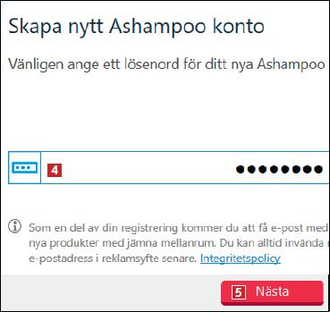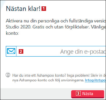 Du behöver skapa ett konto hos Ashampoo innan du kan använda programmet – det är helt gratis. Här visar vi hur det går till. Om du redan har ett Ashampoo-konto, loggar du bara in på det genom att skriva e-postadressen till kontot i steg 1 i den här guiden.