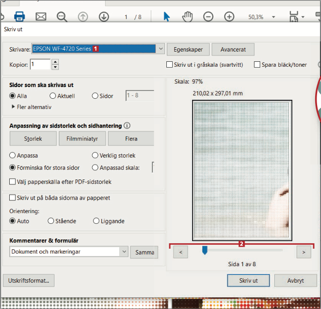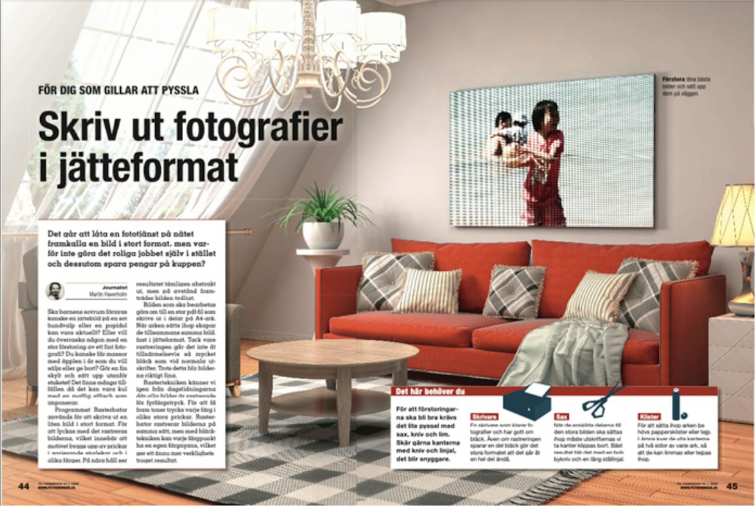 När bilden är klar och öppnad i ditt pdf-program ska den skrivas ut. Det går åt ett antal ark som ska sättas ihop i rätt ordning. Sedan återstår det roligaste – att sätta ihop sidorna till den färdiga förstoringen. Ju noggrannare du är i detta steg, desto finare blir det.