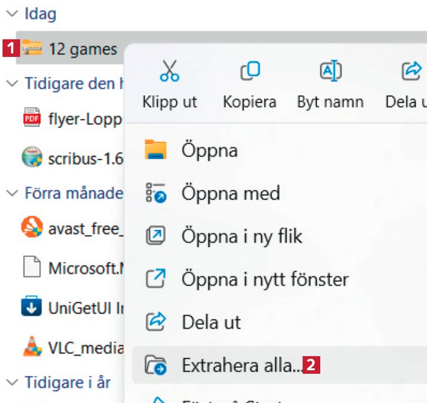 Hämta spelpaketet 12 kul spel från vår webbplats. Det kommer som en zip-fil måste packas upp. Högerklicka på den hämtade filen 1 i Utforskaren och välj Extrahera alla... 2.