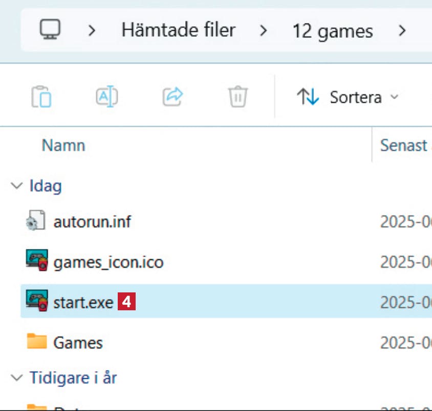 Öppna den skapade mappen. Här ska du dubbelklicka på start.exe 4 för att starta menyn för spelen i paketet.