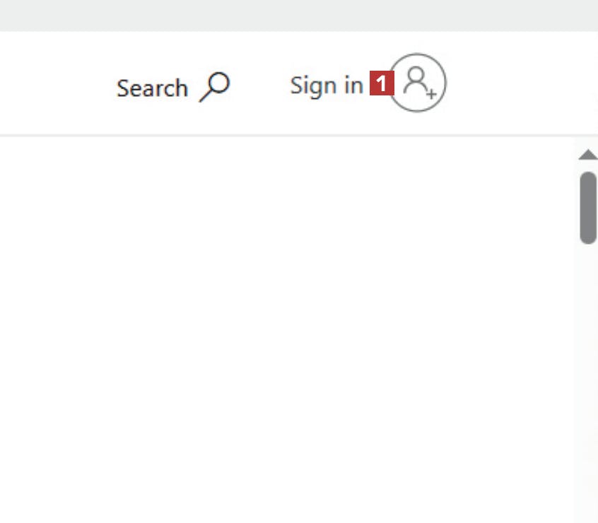 Besök account.microsoft.com. Klicka på Sign in 1 (eller Logga in) uppe till höger.