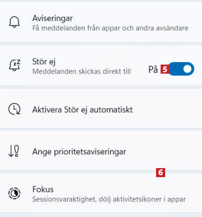 Aktivera funktionen Stör ej 5. Klicka på Ange prioritetsaviseringar 6 för att välja vilka appar som får skicka aviseringar.