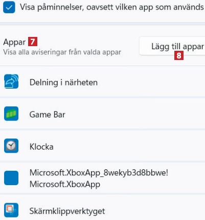 Under Appar 7 kan du välja specifika appar som ska få visa aviseringar. Klicka på knappen Lägg till appar 8 för att lägga till ett program eller en app i listan.