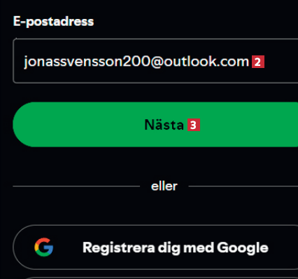 Innan du kan börja lyssna på musik och poddar med Spotify måste du skapa ett användarkonto. Det kostar ingenting och allt du behöver är en mejladress.