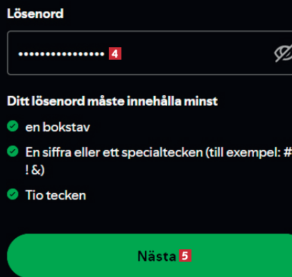 Välj ett lösenord 4 som uppfyller Spotifys krav som står under textfältet. Klicka sedan på Nästa 5.