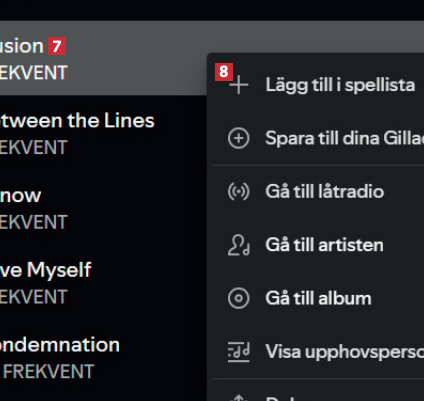 Högerklicka på en låt 7 och håll muspekaren över Lägg till i spellista 8. Du kan också dubbelklicka på en låt för att höra den direkt.