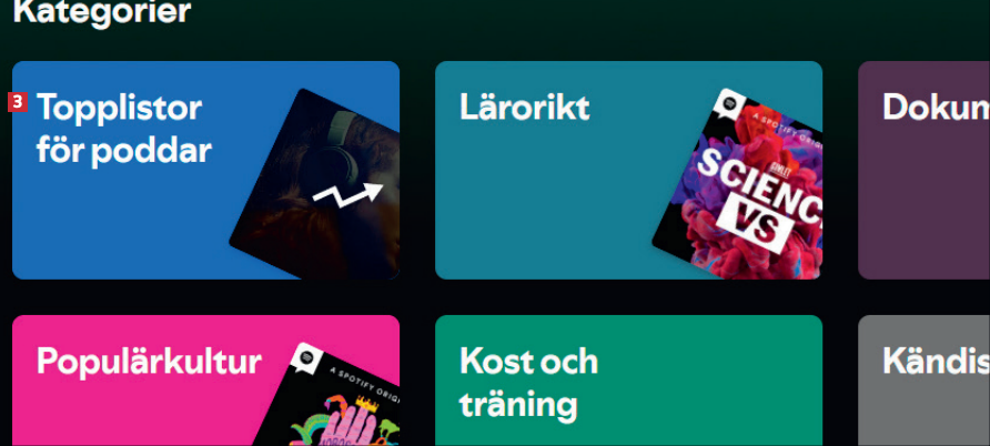 Ett antal kategorier presenteras. Du kan bland annat välja podcasts om olika ämnen eller som dokumentärer genom att klicka på kategorin. I det här exemplet väljer vi dock Topplistor för poddar 3.