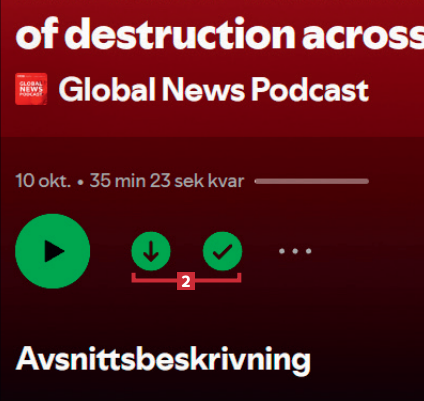 Öppna Spotify och leta reda på det podcastavsnitt du vill ladda ner. Klicka på den nedåtriktade pilen 1 bredvid uppspelningsknappen.