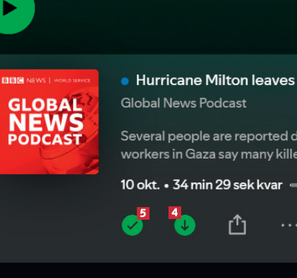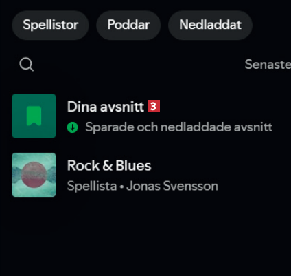 Podcasts som du har hämtat kommer att läggas till i en spellista som heter Dina avsnitt, som Spotify skapar automatiskt. Klicka på listan 3 till vänster i programmet.
