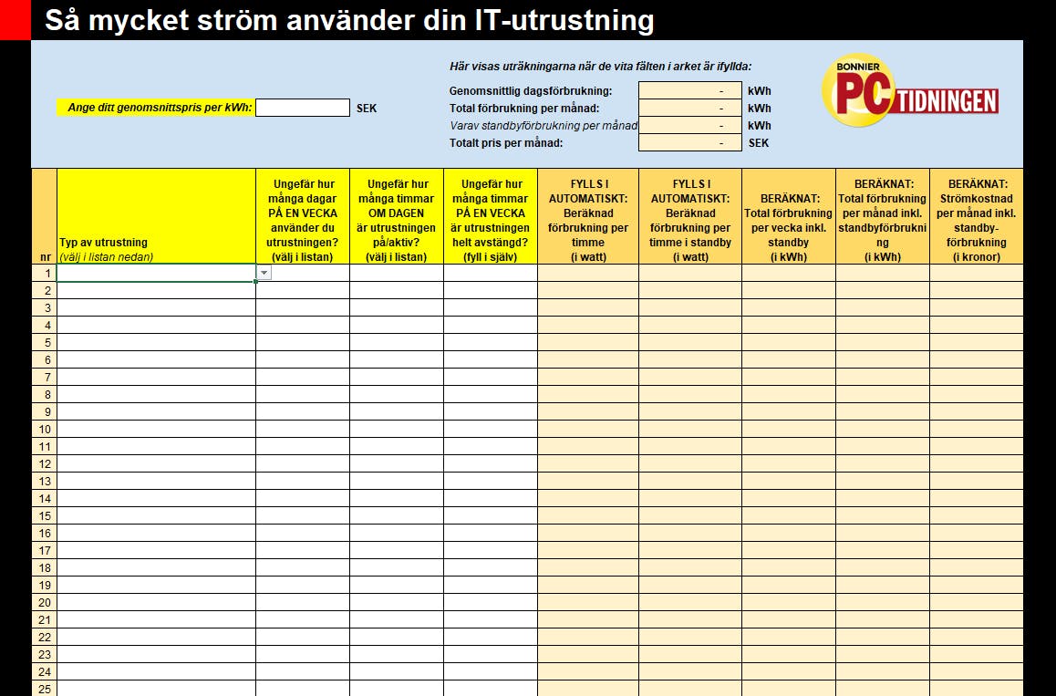 Du kan använda PC-tidningens smarta energisparark för att räkna ut hemmets totala energiförbrukning – både i kilowattimmar och i kronor och ören. Kalkylbladet är särskilt effektivt för att visa var du tjänar mest på att dra ner förbrukningen. Du kan öppna kalkylbladet i programmen Excel och LibreOffice Calc, som du hittar i Fördelszonen – eller importera det till Googles onlineverktyg Kalkylark.
