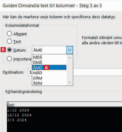 I menyn Datum 5 väljer du ÅMD 6 eller det datumformat du vill använda. Klicka på Verkställ nederst i fönstret.