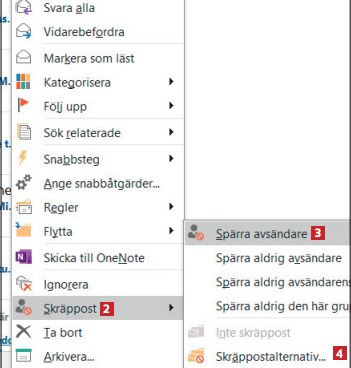 Långt ner i menyn Skräppost 2 följt av Spärra avsändare 3 . Klicka sedan på Skräppostalternativ 4 .