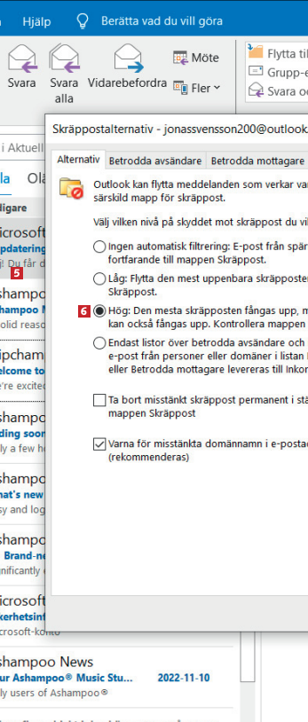 Nu kan du ställa in en allmän nivå för skräppost. Vi föreslår Hög 5 . Klicka sedan på Använd följt av OK 6 . Nu kommer du att få mindre skräppost.
