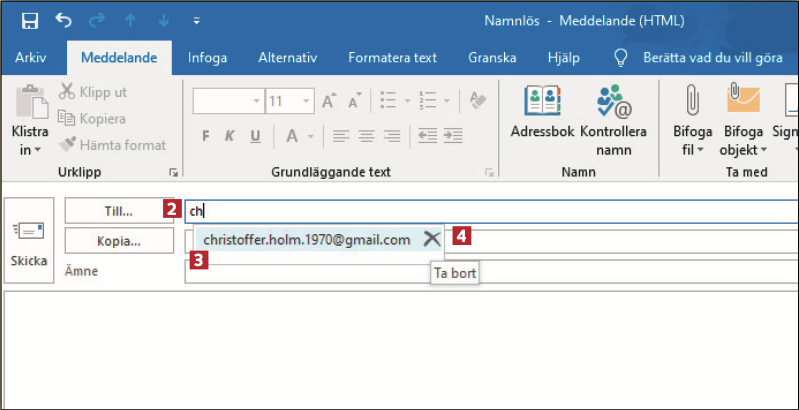 Till 2 föreslår Outlook en e-postadress som du har skickat