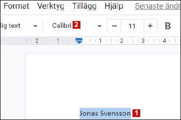 Skriv först lite text och markera den 1. Välj sedan det önskade teckensnittet. Vi tar Calibri 2 istället för Arial som är Googles standard.