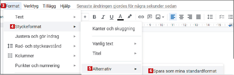 Välj Format 3 följt av Styckeformat 4 och Alternativ 5. Klicka slutligen på alternativet Spara som mina standardformat 6.
