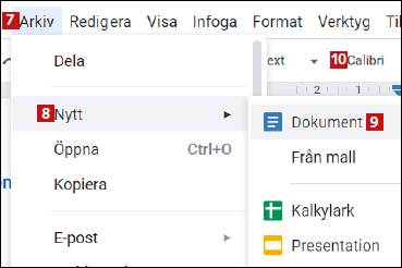 Nu öppnar vi ett nytt dokument: Välj Arkiv 7 följt av Nytt 8 och Dokument 9. Det nya dokumentet har automatiskt Calibri 10 som teckensnitt.