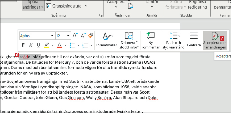 När din vän öppnar dokumentet kan han markera ett ändrat stycke text 6 och högerklicka på det. Han godkänner ändringen genom att välja Acceptera 7 eller avvisar den med Neka överst i fönstret.