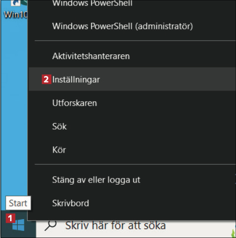 Högerklicka på Start-knappen 1 och välj Inställningar 2 .