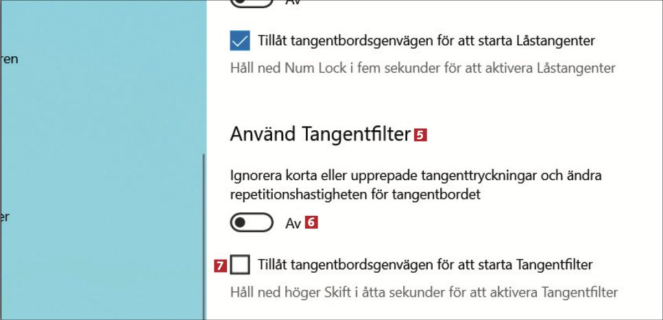 Gå ner till avsnittet Använd tangentfilter 5 . Se till att skjutreglaget är avstängt 6 och avmarkera Tillåt tangentbordsgenvägen för att starta Tangentfilter 7 . Det sistnämnda ser till att du inte råkar aktivera funktionen igen.