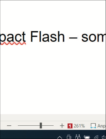 I nedre högra hörnet av Word på nätet kan du se en siffra för zoom. Här 261%. Klicka på siffran 1 för att justera den.