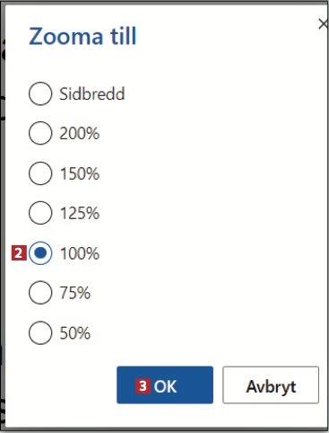 Välj nu 100% 2 och klicka på OK 3 för att återgå till Words vanliga utseende.
