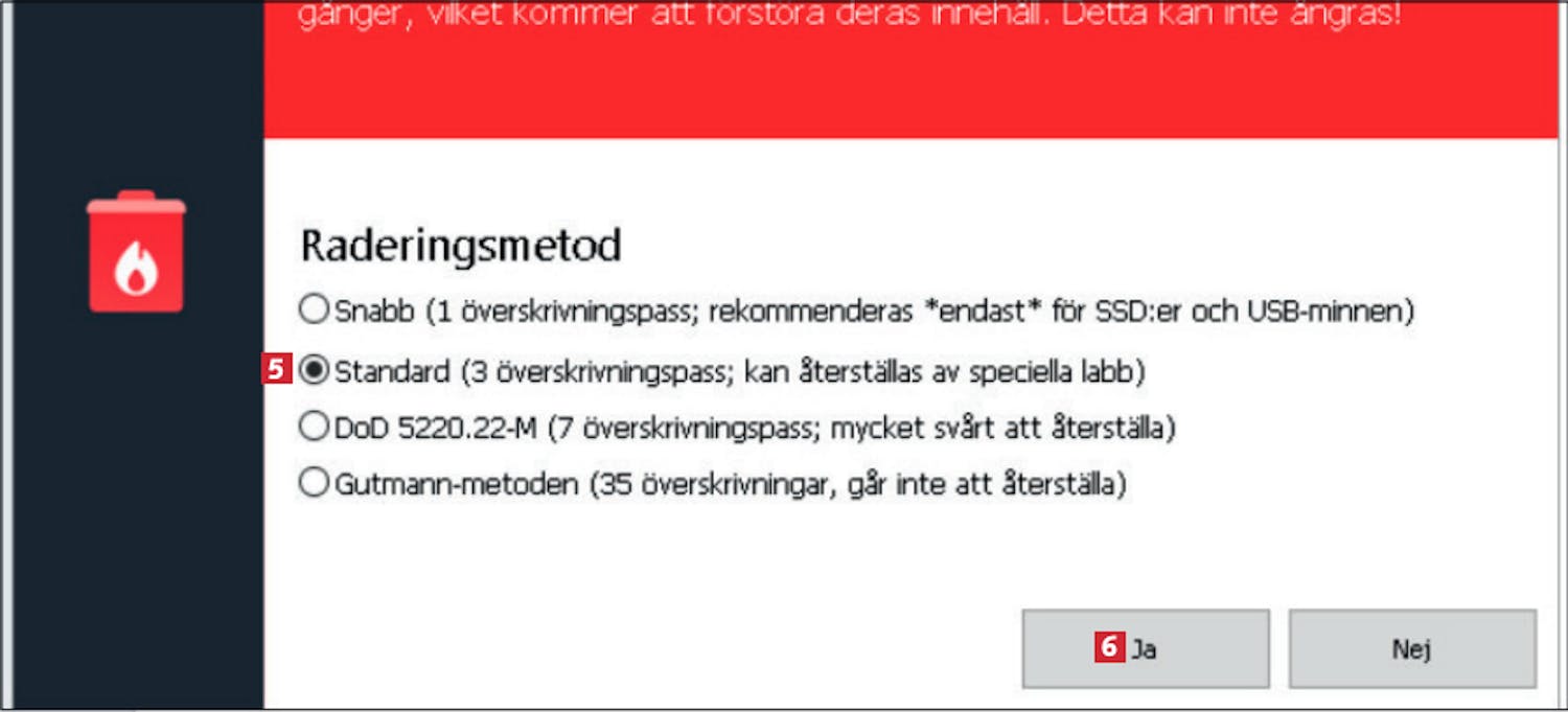 Om du vill vara säker på att en fil aldrig ska kunna hittas igen, kan du radera den fullständigt genom att skriva över den flera gånger. Den tekniken bemästrar Ashampoos program. Du kan välja mellan olika metoder för att radera filerna. Observera att de som är mest grundliga tar lång tid att genomföra. Vi rekommenderar att du väljer standardmetoden för vardagsbruk.