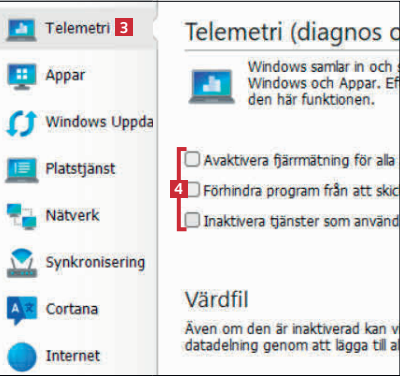 Under fliken Telemetri 3 kan du stänga av 4 Windows möjligheter att skicka data om systemet tillbaka till Microsoft.