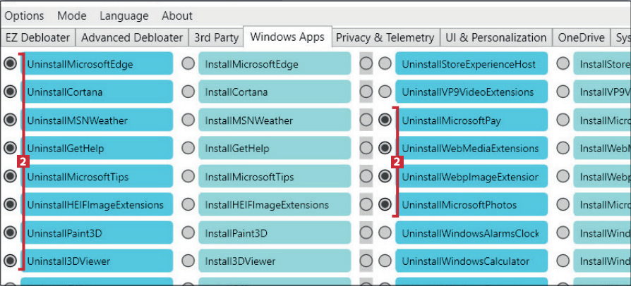Nu när vi har följt programmets rekommendationer och städat lite i Windows ska vi besöka de andra flikarna i programmet, där du bland annat kan ta bort de oönskade program som är en del av Windows. Du markerar det du vill ta bort och slutför sedan alla ändringar under fliken ”Output”.